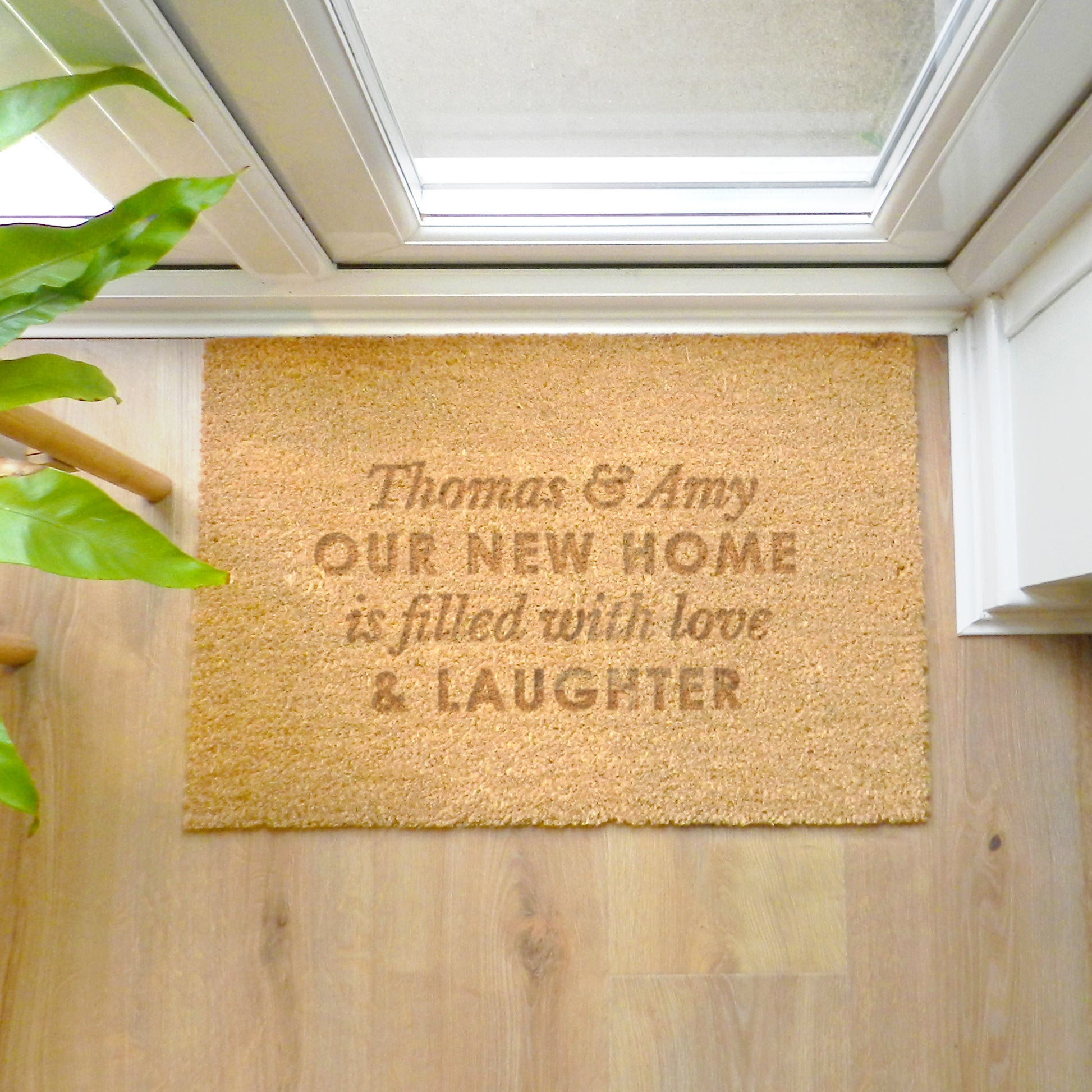This coir, non-slip rectangle doormat can be personalised with four lines of up to 20 characters per line.